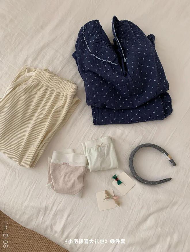 杜小宅惊喜大礼包八件套来啦! 品质和颜值都在线,绝对远超心理价位!里面包含:宅家外出两不误的时髦家居服二件(款式不限一件上衣➕一条裤子)、居家外穿都方便的懒人裤一条、小内内二条、ins风简约韩系发箍一个、氛围感精致小发夹二个。热热闹闹的一大包,每件都是很实用的日常单品!