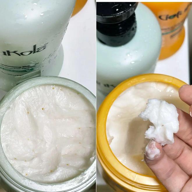 绿膜呢,更针对头皮问题,适合油头、细软塌发质。用的时候着重在头皮、发根的位置按摩1分钟再洗掉,它会深入头皮清除各种杂质和多余油脂。